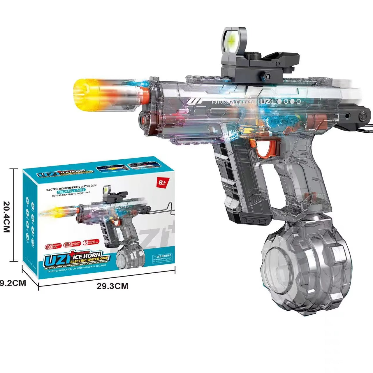 Disfruta de la Pistola UZI eléctrica con ráfaga automática, luces LED tipo fuego y tanque de gran capacidad (800ml). Recargable por USB, sin pilas. Ideal para juegos en la piscina, playa o jardín. Apta para niños y adultos.